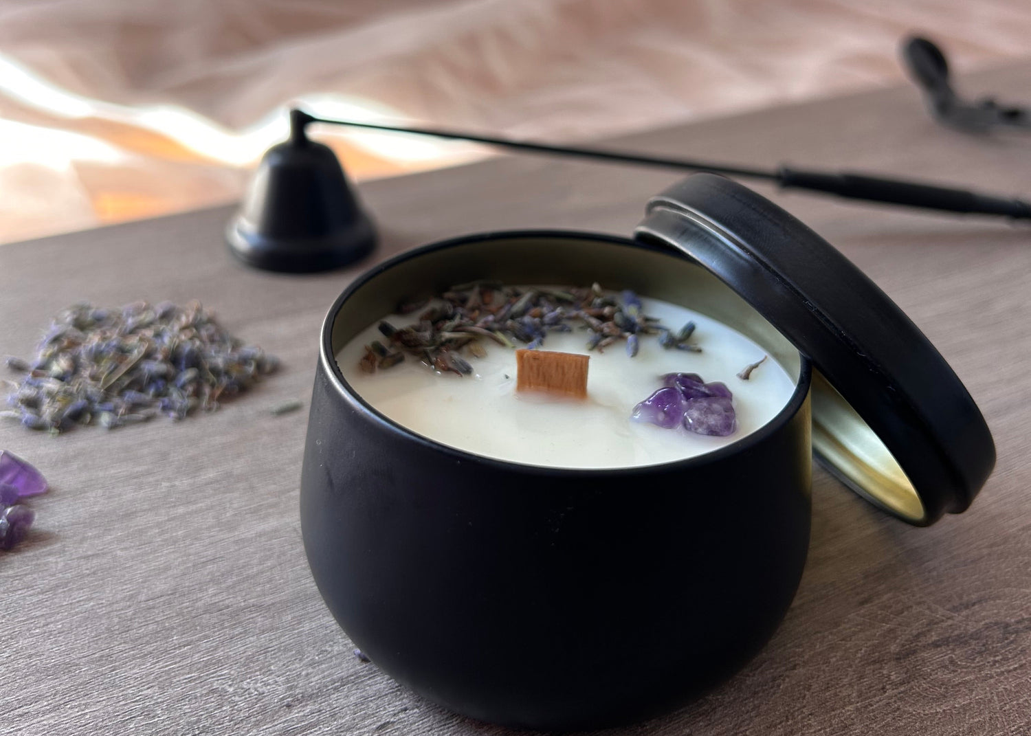 Déjate envolver por el intenso aroma a lavanda, capaz de transformar cualquier espacio en un refugio de calma. Cada vela incluye piedras de amatista, conocidas por su poder para relajar la mente y armonizar las emociones.