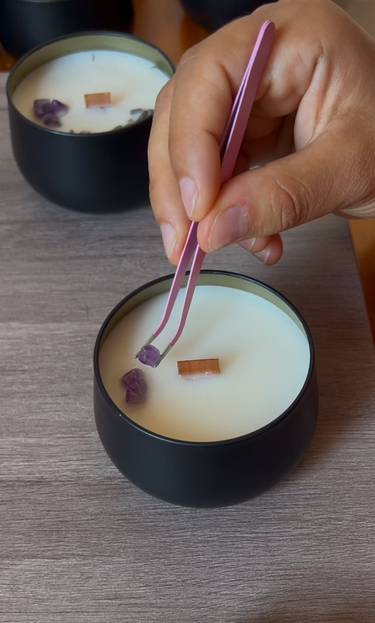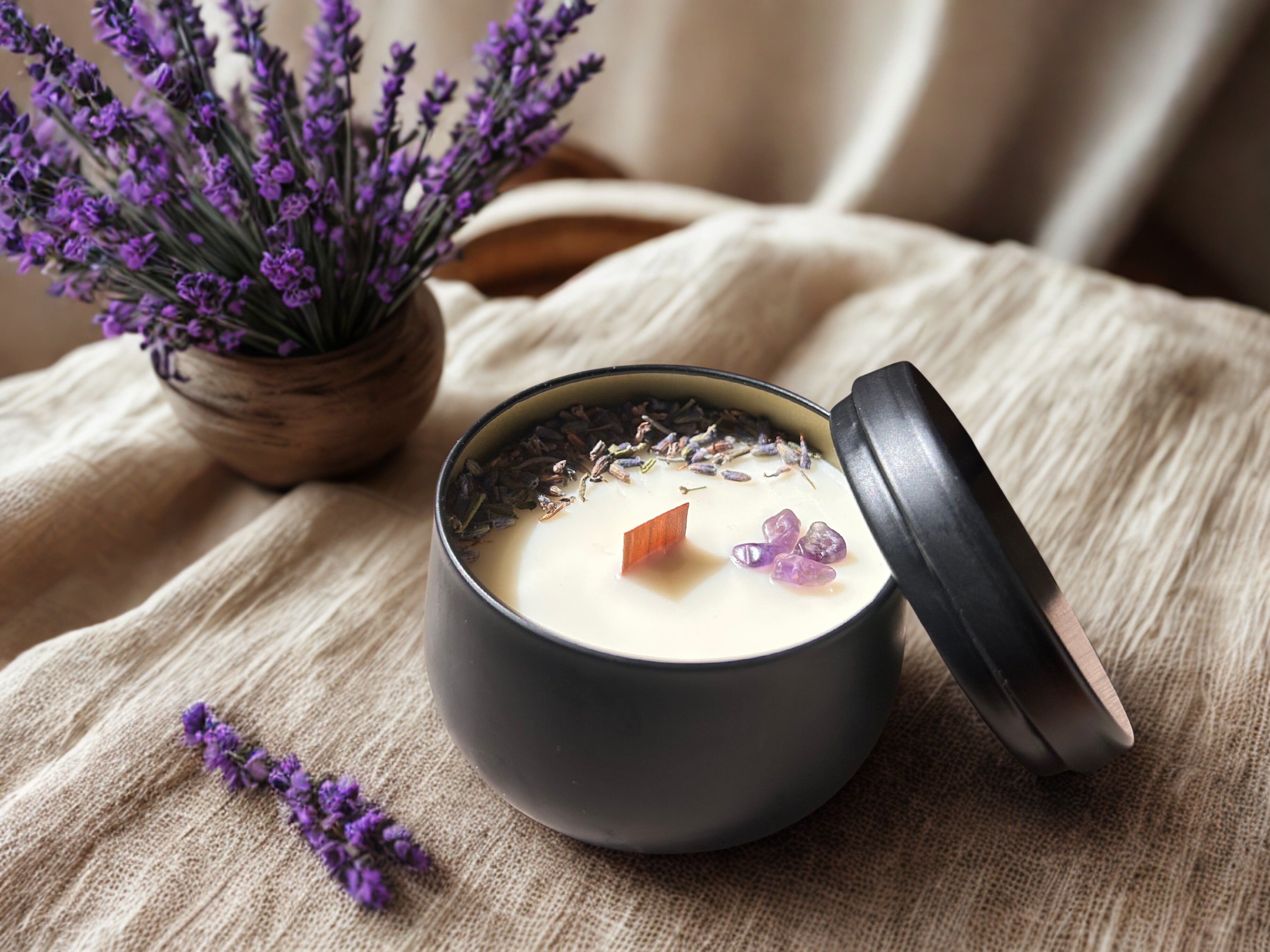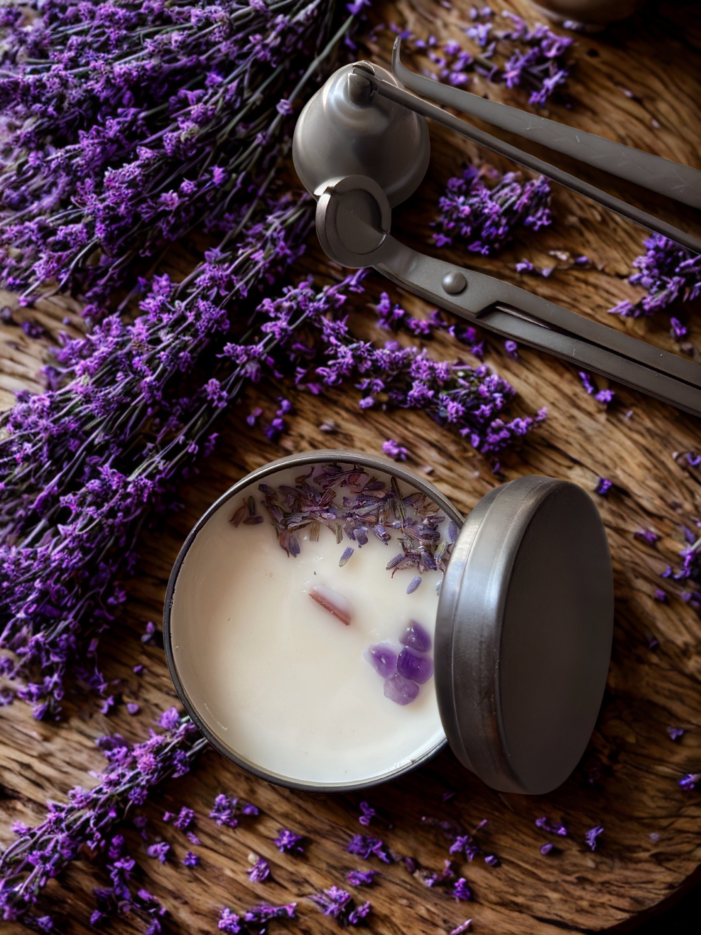 Déjate envolver por el intenso aroma a lavanda, capaz de transformar cualquier espacio en un refugio de calma. Cada vela incluye piedras de amatista, conocidas por su poder para relajar la mente y armonizar las emociones.